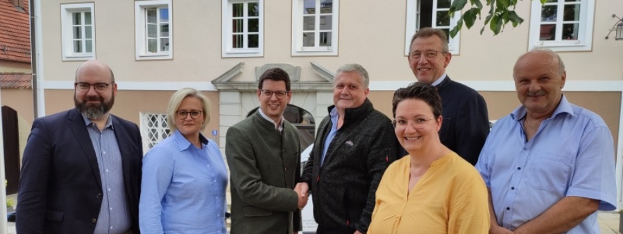 Dem Vorstand Werner Köckeis (Mitte) wünschte Bürgermeister und Verwaltungsratsvorsitzendem Martin Pichler per Handschlag gutes Gelingen. Für den Verwaltungsrat stehen die Räte Markus Roth (weitere v.l.), Carolin Garhammer, Veronika Egger und Karl Schneck zur Seite. Günther Kellermann wirft als Kämmerer der Marktgemeinde den Blick auf die Zahlen, die für die Kommune positiv ausfallen sollen