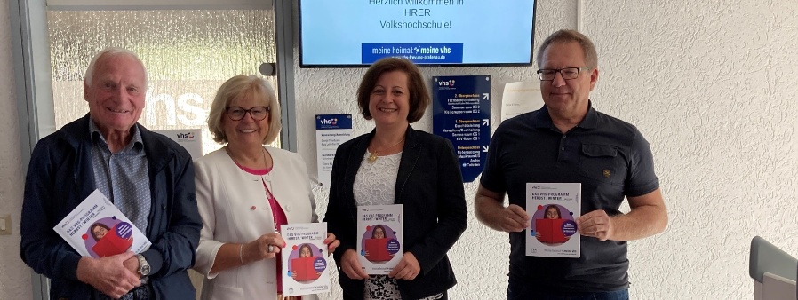 Im Foyer der Grafenauer VHS-Geschäftsstelle präsentiert im Beisein von stv. Landrätin Helga Weinberger (2.v.l.), die Vhs-Führungsriege (v.l.n.r.) mit dem ehrenamtlichem Leiter Willi Schindler, stv. Geschäftsführerin Klara Köck und Geschäftsführer Michael Dietz das neue VHS-Semesterprogramm