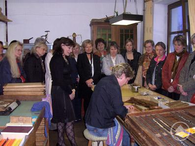 Cornelia Stix (vorne Mitte) und ihre Mitarbeiterin Rosmarie Fruth (sitzend) demonstrierten den wild&weiblich-Mitgliedern wie eine Zigarre handgerollt wird.