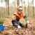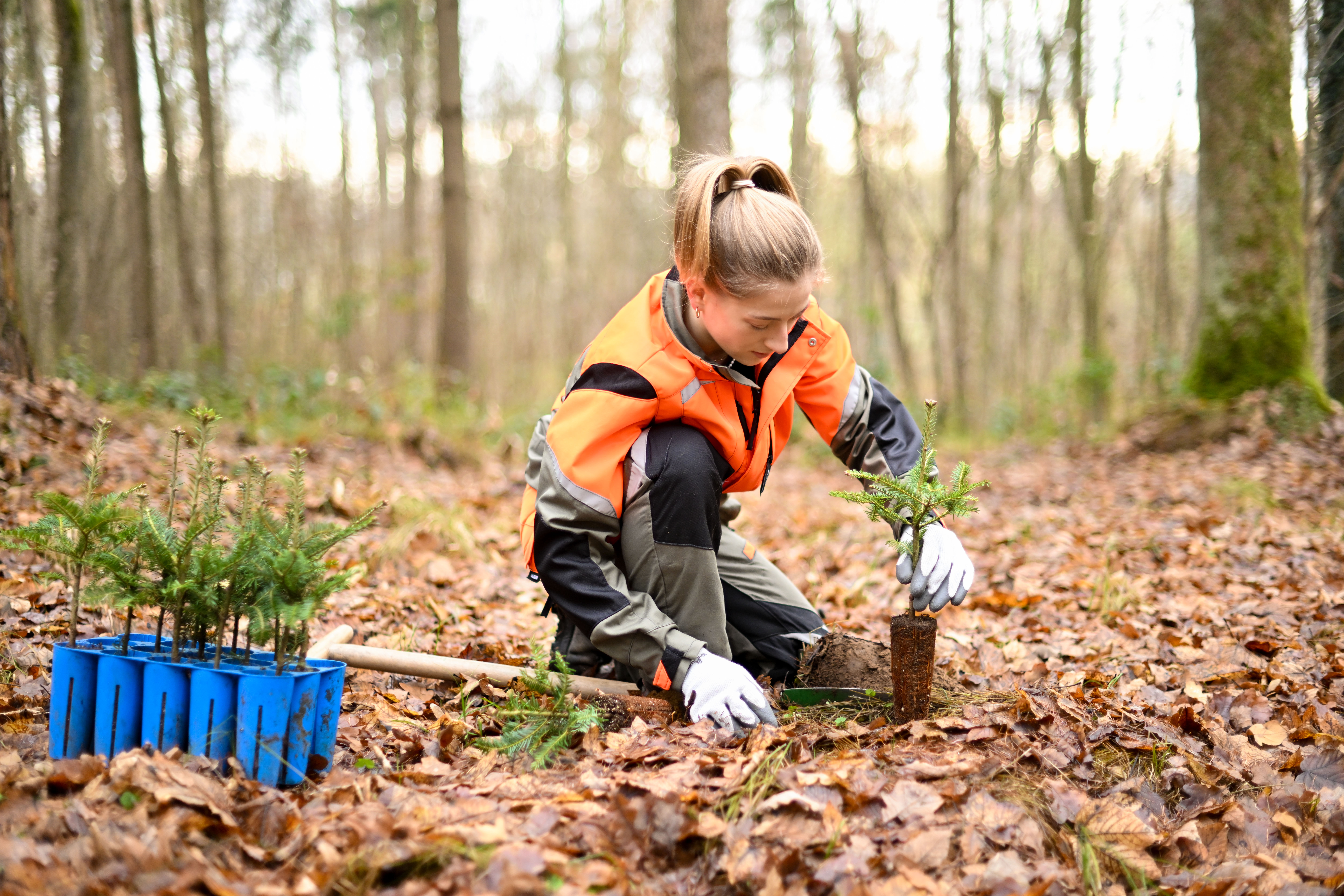 Forstwirtin pflanzt Jungpflanzen mit dem Hohlspaten