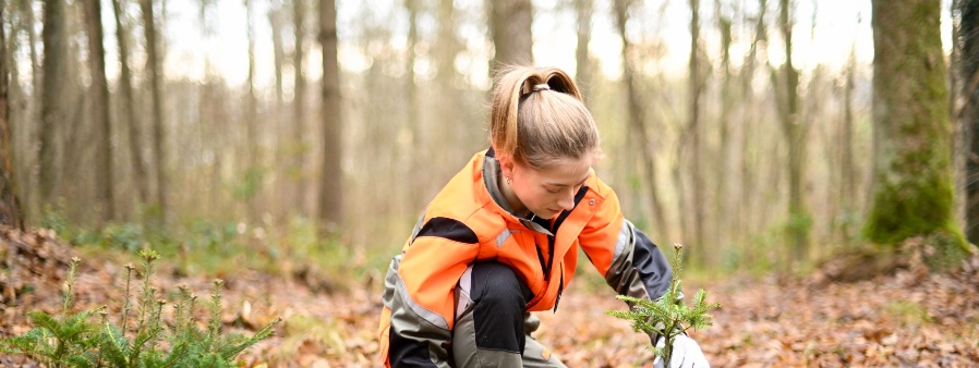 Forstwirtin pflanzt Jungpflanzen mit dem Hohlspaten