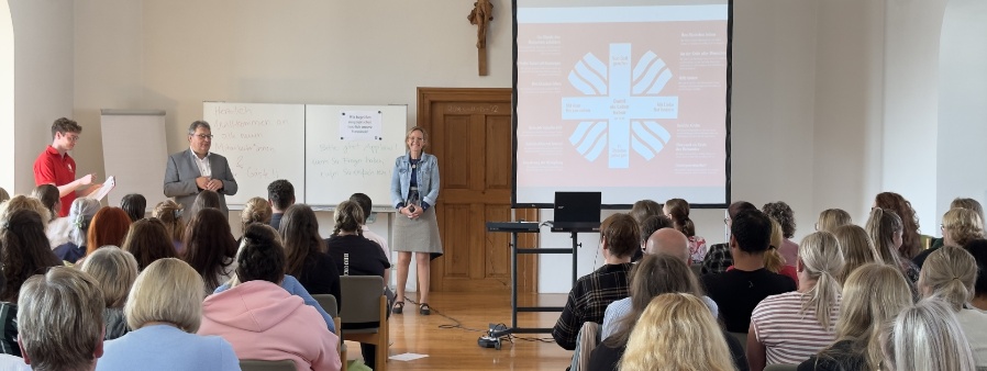 Zum Start in den Verband hat die Abteilung Bildung mit der Leiterin, Michaela Meindl, und ihrem Team um Anna Brose und Fritz Müller, eine neue Form der Begegnung eingeführt, welcher nun in diesem Jahr schon das dritte Mal stattgefunden hat. An den Gesichtern der neuen Kolleg*innen konnte man deutlich erkennen, dass die neue Art des Einführungstages sehr gut angenommen wird. Sie wissen sich als Teil einer starken Gemeinschaft, die für die Menschen unterwegs ist. Tatsächlich „Ein Job fürs LEBEN“. „Es freut mich sehr“, so Meindl, „dass das neue Konzept des ‚Einführungstages für neue Mitarbeiter*innen so gut ankommt und mittlerweile jeweils um die 70 Kolleg*innen zu diesem Tag begrüßt werden dürfen. Sie alle erhalten hier wertvolle Informationen über ihren neuen Arbeitsplatz im Caritasverband, lernen aber auch die Größe ihres Arbeitgebers kennen. Mein Dank geht an alle Beteiligten des Tages, vor allem aber an das Team vom Fachbereich Allgemeinen Kompetenzbildung der Abteilung Bildung, sie haben das neue Konzept federführend entwickelt und begleiten durch den Tag.“