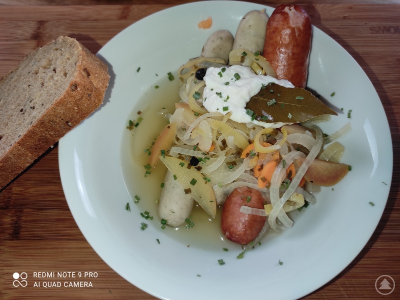 6. Die Sauren Zipfel zusammen mit frischem Brot und Meerrettich servieren. Streut etwas getrockneten Schnittlauch über die Würste und den Sud.