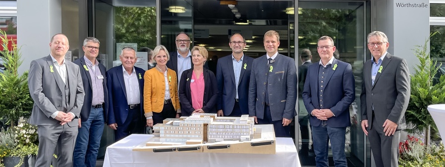 Vor dem Modell des geplanten Anbaus stehen: Ärztlicher Direktor Prof. Dr. Johannes Hamann (v.l.), Oberarzt Dr. Stefan Wosnik, ehemaliger Bezirksrat Horst Wipplinger, Bezirksrätin Cornelia Wasner-Sommer, Passaus Oberbürgermeister Jürgen Dupper, Leitende Ärztin Dr. Claudia Heuschneider, Baureferent Stefan Singer, Bezirkstagspräsident Dr. Olaf Heinrich, Krankenhausdirektor Uwe Böttcher und Pflegedienstleiter Jürgen Frohnmaier.