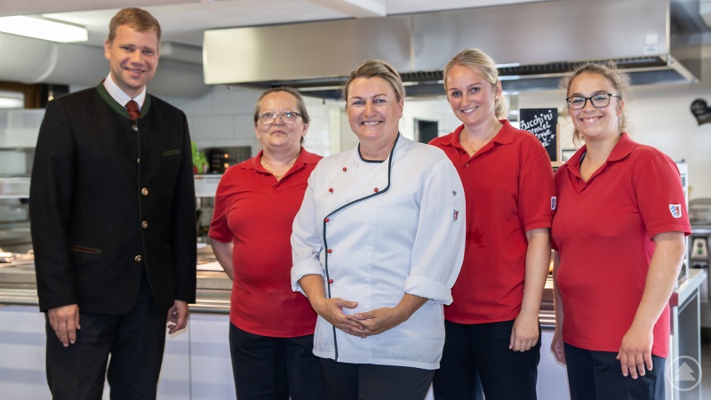 Bezirkstagspräsident Dr. Olaf Heinrich (links) besucht das Küchenteam des Agrarbildungszentrums Landshut-Schönbrunn um Verpflegungsleiterin Margit Huber (Mitte).