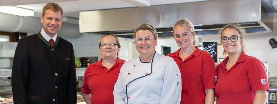 Bezirkstagspräsident Dr. Olaf Heinrich (links) besucht das Küchenteam des Agrarbildungszentrums Landshut-Schönbrunn um Verpflegungsleiterin Margit Huber (Mitte).