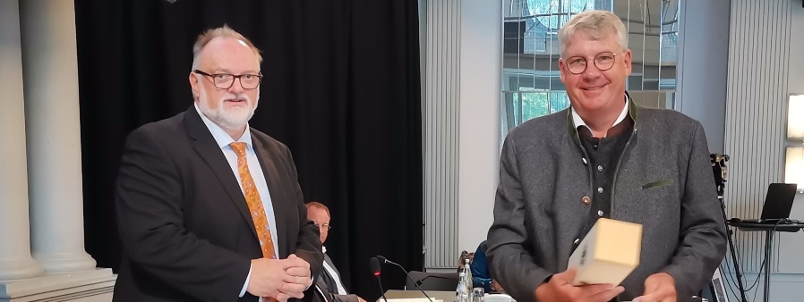 Der Oberbürgermeister gratulierte im Vorfeld der letzten Plenumssitzung und händigte ihm die Urkunde sowie als kleines Dankeschön eine Flasche Passauer Stiftswein aus.