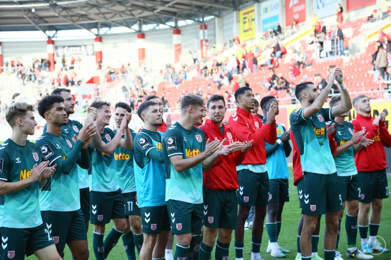 Zur zweiten Halbzeit ging der angeschlagene Alex Bittroff vom Feld, für ihn kam Robin Ziegele. Beide Mannschaften neutralisierten sich zu Beginn. Halle nutzte schließlich seine erste Torchance: Casars Fernschuss nahm Baumann auf Höhe des Elfmeterpunktes an und ließ Gebhardt mit einem satten Schuss keine Chance – das 1:0 für die Gastgeber (55.). Die Jahnelf hatte den Schock aber gleich verdaut – Oscar Schönfelder kam im Anschluss an eine schöne Kombination halbrechts zum Schuss – knapp drüber (56.). Nun war es ein offener Schlagabtausch. Berko kam nach einer Flanke von rechts zum Abschluss, Gebhardt aber war rechtzeitig unten (64.). Jahn Chef-Trainer Joe Enochs brachte drei frische Kräfte: Eisenhuth, Kother & Huth ersetzten nach einer knappen Stunde Hottmann, Diawusie & Ganaus. Zunächst aber blieb Halle die aktivere Mannschaft: Deniz verfehlte das Tor mit einem Distanzschuss ein paar Meter (68.). Der Jahnelf drohte die Partie etwas zu entgleiten, doch dann packte Christian Viet den Hammer aus: Der Jahn Offensivspieler hielt aus knapp 25 Metern einfach drauf und setzte den Ball unhaltbar für Müller unter die Latte – was für ein Strahl (69.). Die zweite Halbzeit hatte nun deutlich mehr Höhepunkte auf Lager. Eisenhuth probierte es zweimal mit einem Fernschuss (71.) und nach einem Freistoß (74.) – ein weiterer Jahn Treffer blieb aber zunächst verwehrt. Nun kippte das Spielmoment aber immer mehr wieder in Richtung der Jahnelf. Faber chippte den Ball von rechts in den Fünfer und der eingewechselte Elias Huth setzte den Ball per Kopf ins rechte Ecke zum 1:2 – das Spiel war gedreht, die Jahn Spieler drehten in Richtung des jubelnden Gästeblocks (79.). Halle versuchte nun verzweifelte Angriffe: Ziegele grätschte im Strafraum gegen den eingewechselten Crosthwaite spektakulär (84.). Casar packte im Strafraum einen Fallrückzieher aus, aber dieser stellte Gebhardt vor keine Probleme (87.). Die Schlussphase wurde nun hektischer, beide Teams schenkten sich nichts. Vier Minuten wurden im Leuna-Chemie-Stadion nachgespielt. Doch die Jahnelf verteidigte die langen Bälle und letzten Versuche der Hallenser souverän weg. Drei weitere Zähler gehen damit aufs das Jahn Punktekonto, das nun bei 25 steht.