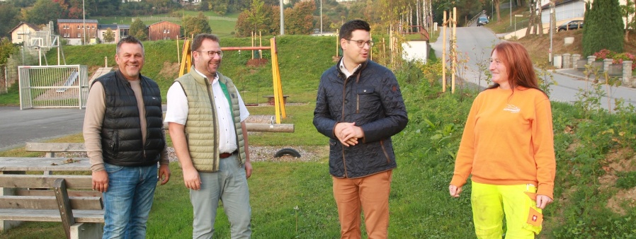 Tina Meisetschläger erklärte Bürgermeister Martin Pichler sowie den Räten Hans-Jürgen Perl und Herbert Kern die Maßnahme, für die Pflanzen im Wert von knapp 7 000 Euro besorgt wurden.
