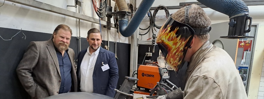 Der Film- und Theaterschauspieler Michael Alexander Grimm, hier mit Werkstatt-Leiter Georg Bachmeier (re.) im Metallbereich, wie ein Mitarbeiter Feuerschalen schweißt.