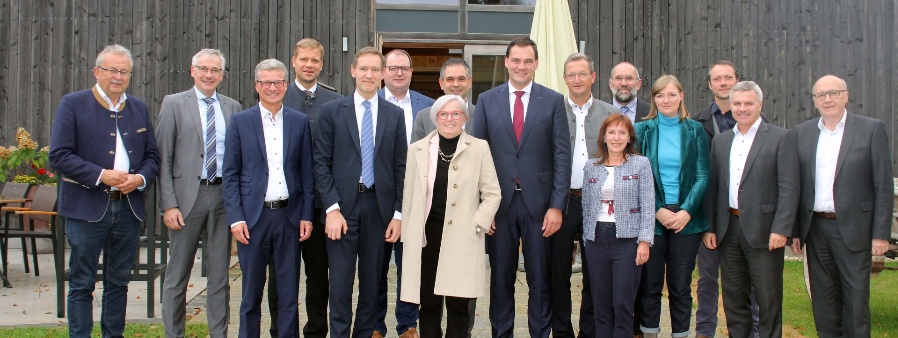 Von links: Landrat Josef Laumer (Straubing-Bogen), Landrat Werner Bumeder (Dingolfing-Landau), Landrat Bernd Sibler (Deggendorf), Bezirkstagspräsident Dr. Olaf Heinrich, Regierungspräsident Rainer Haselbeck, Landrat Michael Fahmüller (Rottal-Inn), gastgebende Landrätin Rita Röhrl (Regen), Landrat Raimund Kneidinger (Passau), Landrat Sebastian Gruber (Freyung-Grafenau, niederbayerischer Bezirksvorsitzender des Landkreistags), Präsident des Bayerischen Bauernverbands Siegfried Jäger, Geschäftsführerin des Bayerischen Landkreistags Andrea Degl, Direktor des Bayerischen Bauernverbands Peter Huber, Miriam Dick (Projektleiterin Genussregion Niederbayern), 1. Genussbotschafter Niederbayerns Bernhard Senkmüller, Landrat Peter Dreier (Landshut) und Landrat Martin Neumeyer (Kelheim).