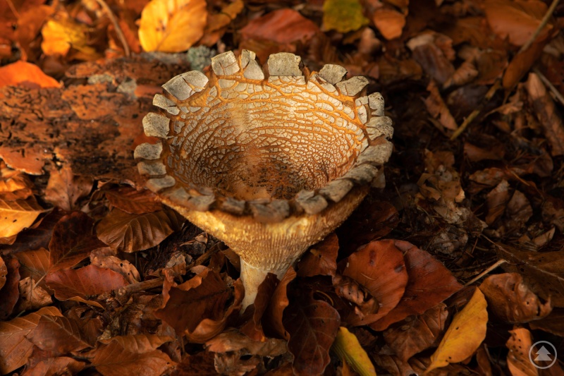 Dieser Pilz hat ein ganz besonderes Aussehen: Mit zunehmendem Alter und nachlassender Körperstruktur hat sich seine Kappe nach innen gewölbt. Diese hat etwa 20 cm Durchmesser und ist an ihrem Rand stark eingerissen. Zurückgeblieben sind kleine graue "Würfelstücke", auch die Lamellen an der Unterseite sind inzwischen marode geworden. Sein Fundort liegt im "Großen Filz" vor Riedlhütte.