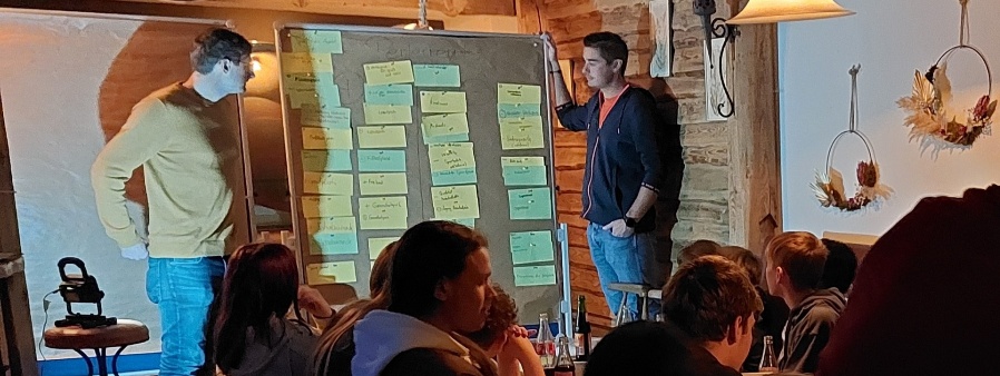 Die Jugendbeauftragten Christian Brandl (links) und Manuel Wimmer (rechts) der Marktgemeinde diskutieren die zuvor gesammelten Ideen mit den Jugendlichen von Perlesreut.