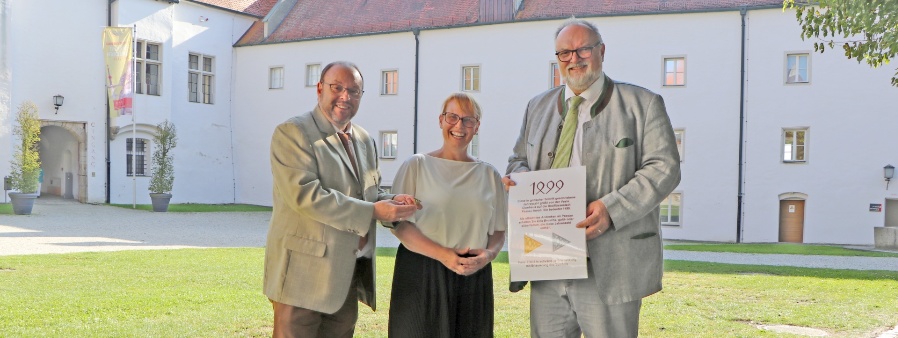 Die Jahreszahl 1499 ziert nicht nur die weithin sichtbare Südfassade der Veste Oberhaus, sondern auch eine Anstecknadel, die exklusiv von Mitgliedern des Fördervereins Oberhausmuseum Passau erworben werden kann. Oberbürgermeister Jürgen Dupper nahm kürzlich selbst ein Exemplar in Empfang und informierte sich aus diesem Anlass über die Aktivitäten des Vereins.