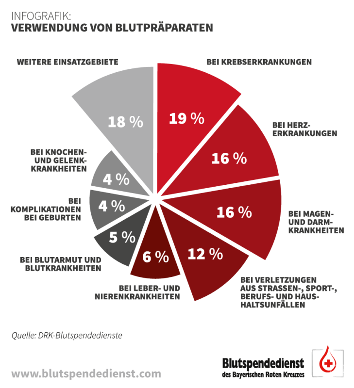 Die Blutspende kommt den unterschiedlichsten Personengruppen zu Gute. 19% fließen in die Krebstherapie, 16% dienen Herzerkrankten, weitere 16% werden für Magen- und Darmerkrankte verwendet und 12% kommen Unfallopfern zu Gute, wie man der Infografik entnehmen kann.