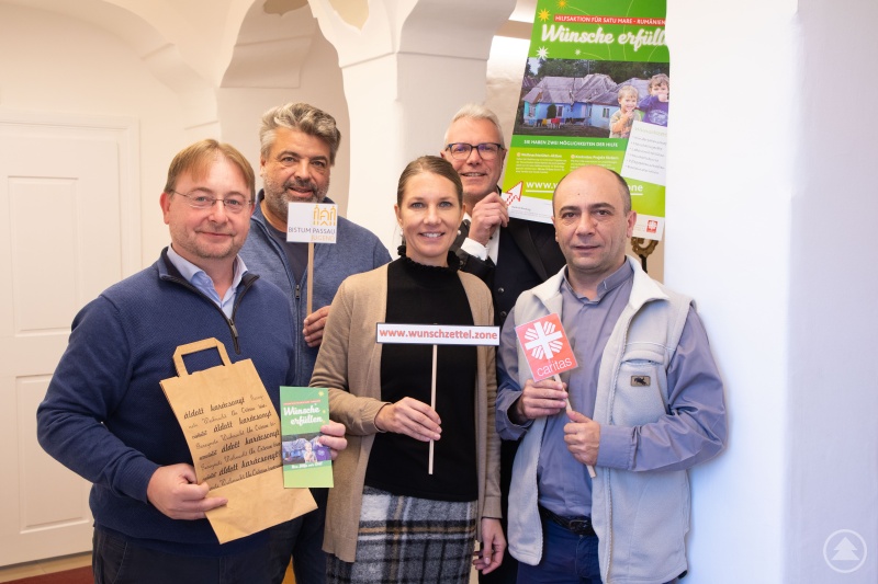 Für die Weihnachtsaktion „wunschzettel.zone“ für Satu Mare haben sich abgestimmt v.li. Generalvikar Chaba Ilyes, Thomas Wimmer, Birgit Klein, Mario Götz und Caritasdirektor Janos Roman.
