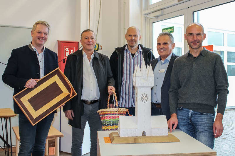 Begutachten die Erzeugnisse der Patienten: Bezirksrat Franz Schreyer, Ärztlicher Direktor Prof. Dr. Joachim Nitschke, Pflegedirektor Walter Blüml, Leiter der Ergo- und Arbeitstherapie Adalbert Sporrer und Krankenhausdirektor Hans Muhr.