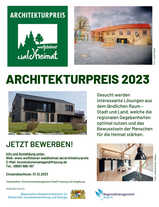 Das Konversionsmanagement der Stadt Freyung und Umgebung lobt heuer in Zusammenarbeit mit den Gemeinden der Wolfsteiner Waldheimat zum dritten Mal den Architekturpreis der Wolfsteiner Waldheimat aus. Mit dem Architekturpreis zeichnen wir regionale Baukultur und gleichzeitig gelungene moderne Architektur aus. Mit der Auszeichnung und der Publikation der Projekte möchten wir insbesondere Besitzer von Altbauten inspirieren, alte Bausubstanz zu erhalten und mit neuem Leben zu füllen.