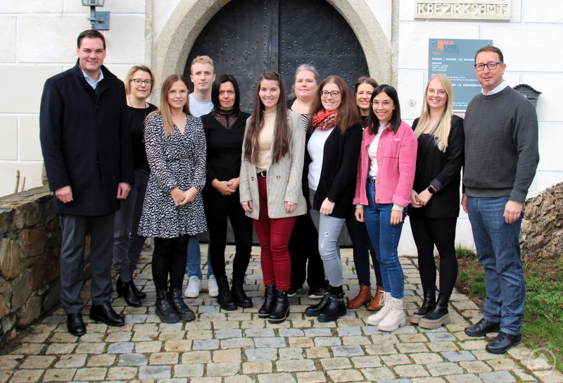 Wer Fachkräfte halten will, muss diese auch fördern. Dessen sind sich (von links) Landrat Sebastian Gruber, die Leiterin der Haupt- und Personalverwaltung Sabrina Schott und (rechts) Personalratsvorsitzender Ale-xander Bertelshofer bewusst. Volle Unterstützung haben sie deshalb den neun Beschäftigten des Landkrei-ses zugesagt, die zeitgleich die Chance nutzen, sich weiterzuqualifizieren (von links): Julia Bauer, Patrick List, Karin Saibold, Theresa Friedsam, Petra Binder, Kathrin Drexler, Sandra Schreiner, Katharina Peterlik, Selina Schlig.