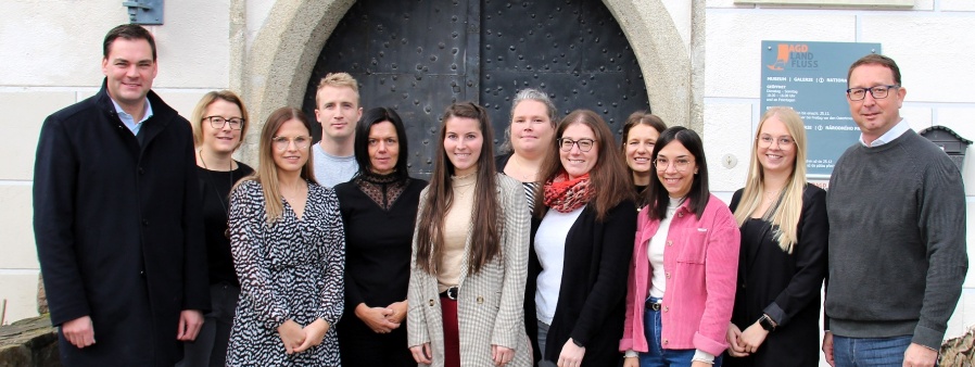 Wer Fachkräfte halten will, muss diese auch fördern. Dessen sind sich (von links) Landrat Sebastian Gruber, die Leiterin der Haupt- und Personalverwaltung Sabrina Schott und (rechts) Personalratsvorsitzender Ale-xander Bertelshofer bewusst. Volle Unterstützung haben sie deshalb den neun Beschäftigten des Landkrei-ses zugesagt, die zeitgleich die Chance nutzen, sich weiterzuqualifizieren (von links): Julia Bauer, Patrick List, Karin Saibold, Theresa Friedsam, Petra Binder, Kathrin Drexler, Sandra Schreiner, Katharina Peterlik, Selina Schlig.