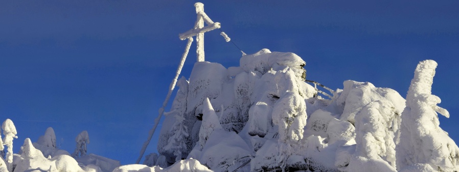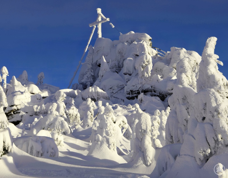 Gestern präsentierten sich die Höhenlagen des Bayerischen Waldes in tiefstem Winterkleid. Die Bergfichten standen vermummt in frostigem Kleid und nahmen märchenhafte Gestalten an. Während es in den Tälern und Bachläufen z.T. eisig kalt war deutete sich auf den Gipfeln der erste Föhn an. So hatte es z.B. in Frauenberg und Haidmühle an der Kalten Moldau unter minus 15 Grad, auf den Bergen herrschten bei minus 1 Grad (um 10.00 Uhr vormittgas) relativ milde Temperaturen. Das Foto zeigt den Hochsteingipfel am Dreisesselkamm (1333 m).
