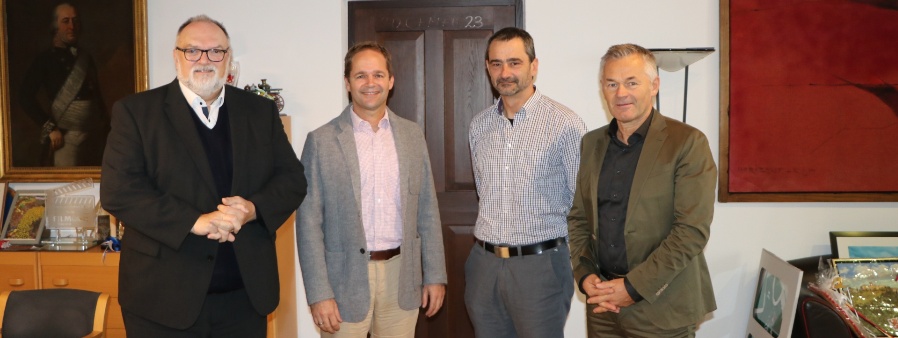 Oberbürgermeister Jürgen Dupper (v. links) begrüßt Thomas Knab (2. v. rechts) in seiner neuen Funktion im Beisein von Klaus Sterner, Fachlicher Leiter der Staatlichen Schulämter in der Stadt und im Landkreis Passau (2. v. links) und Werner Lang, Referent für Wirtschaft und Bildung.