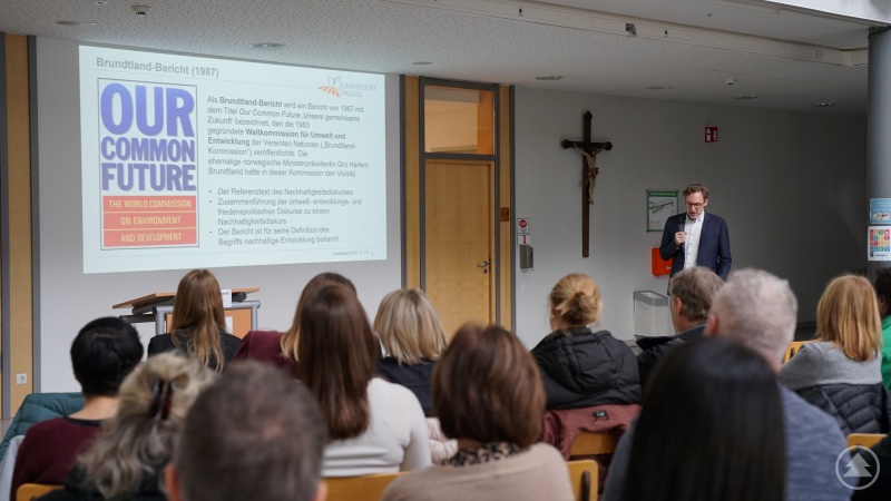 Im Rahmen des Fachtages erläuterte Prof. Dr. Andreas Eberth von der Universität Passau den Lehrkräften, dass der Begriff „Nachhaltigkeit“ weit mehr umfasse als Klimaschutzmaßnahmen.