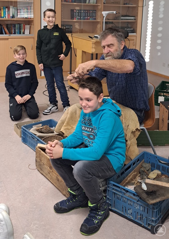 Geschichtsunterricht einmal anders durften die Schülerinnen und Schüler der 6. Klassen der Staatlichen Realschule Grafenau erleben: Der Archäologie-Experte Lothar Breinl besuchte die Schule und unternahm mit den Schülern eine Reise in die Steinzeit.