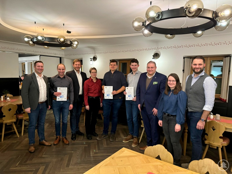 Im Folgenden gab der Kreisvorsitzende bekannt, dass er für drei in besonderem Maße ehrenamtlich engagierte JU-Mitglieder erfolgreich die Verleihung der Bayerischen Ehrenamtskarte angeregt hat. Die Bayerische Ehrenamtskarte kann an Personen verliehen werden, die seit mindestens zwei Jahren mit durchschnittlich fünf Stunden pro Woche oder 250 Stunden pro Jahr ehrenamtlich Engagement sind. Sie ist ein sichtbares Zeichen der Anerkennung und Wertschätzung des vielfältigen ehrenamtlichen Engagements in Bayern. Mit großer Freude konnte Kreisvorsitzender Christoph Weishäupl die vom Landkreis Freyung-Grafenau ausgestellten Ehrenamtskarten an seinen Stellvertreter Dr.-Ing. Sebastian Weber sowie an Kreisgeschäftsführer Martin Höppler und Kreisschriftführer Michael Scherzer überreichen und deren Engagement entsprechend würdigen.