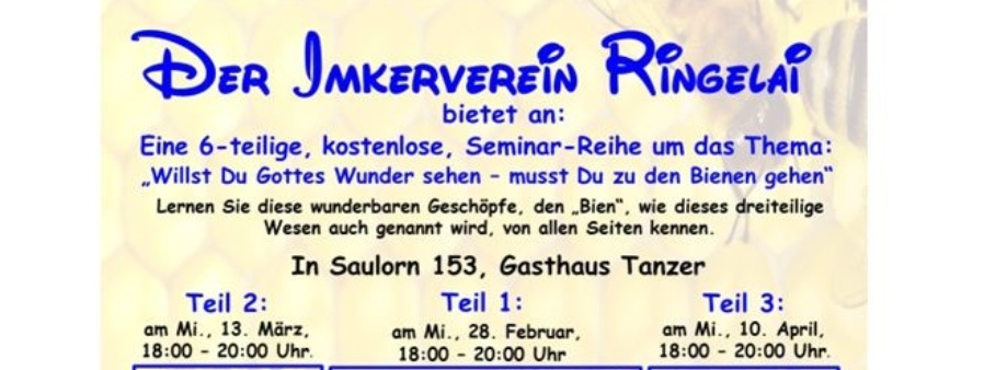 Lernen Sie diese wunderbaren Geschöpfe, den „Bien“, wie dieses dreiteilige Wesen auch genannt wird, von allen Seiten kennen. Der Imkerverein Ringelai bietet dazu ab 28. Februar, ein 6-teiliges Seminar an.