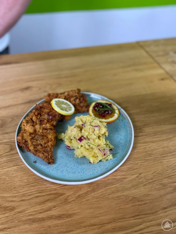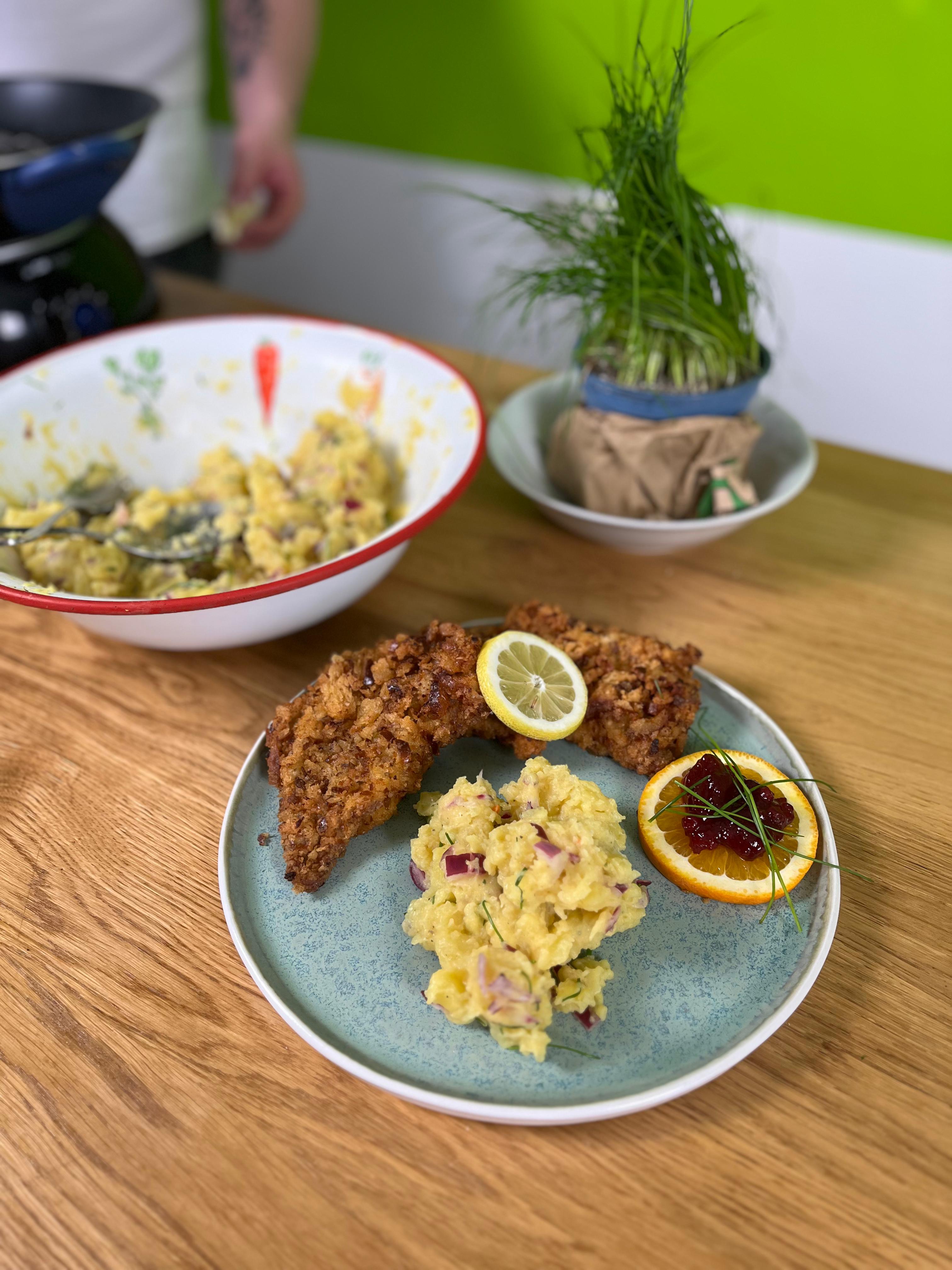 4. Servieren und genießen: Die Wiener Schnitzel auf einem Teller deklassieren ah, ich meinte drapieren, den Gaudi-Kartoffelsalat dazu platzieren und das Festmahl mit einem herzlichen "Marsch, Prost und O'zapft is!" einleiten.