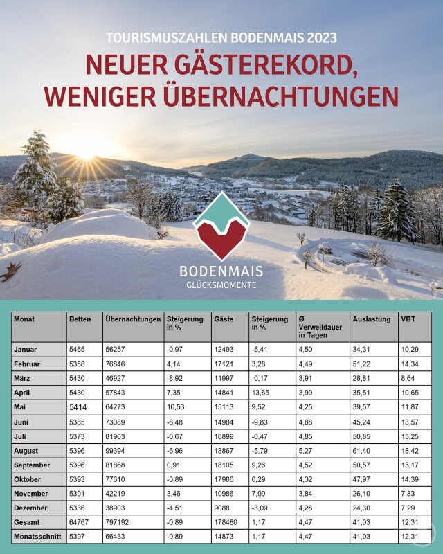 Mit 178.480 Gästen haben im vergangenen Jahr so viele Menschen wie noch nie Urlaub in Bodenmais gemacht. Diese Zahl bedeutet ein Plus von 1,17 Prozent gegenüber 2022, das mit 176.424 Urlaubern das bisherige Rekordjahr war. In den Übernachtungszahlen schlägt sich dieser erfreuliche Trend aber leider nicht nieder, denn diese sind 2023 mit 797.192 im Vergleich zum Vorjahr (804.354) um -0,89 Prozent minimal gesunken. Dementsprechend ist auch die durchschnittliche Verweildauer von 4,56 Tage auf 4,47 Tage etwas zurückgegangen. Die Bettenzahl ist im Schnitt relativ stabil geblieben: 5397 im Jahr 2023 im Vergleich zu 5422 im Vorjahr.