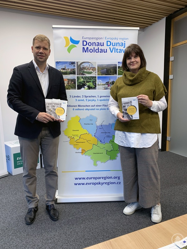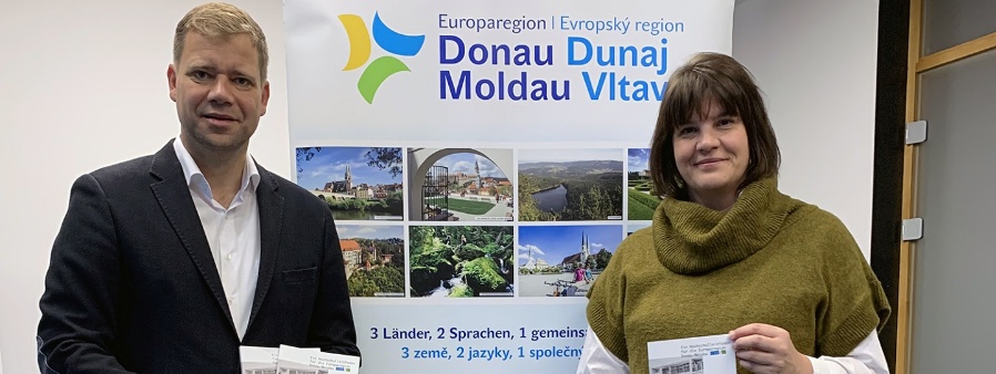 Bezirkstagspräsident und Vorsitzender der Europaregion Donau-Moldau in Niederbayern Dr. Olaf Heinrich präsentiert zusammen mit der Projektmanagerin Barbara Daferner den neuen Hochschulführer.