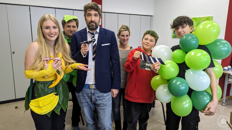 Die Krawatte des Schulleiters musste natürlich dran glauben. Die SMV mit den Verbindungslehrkräften Stephanie Müller-Peter und Manuel Jehl sowie den Schülersprechern Theresa Fischer, Leon Schönberger und Jakob Zechmann überraschten Herrn Klingelhöfer in seinem Büro.