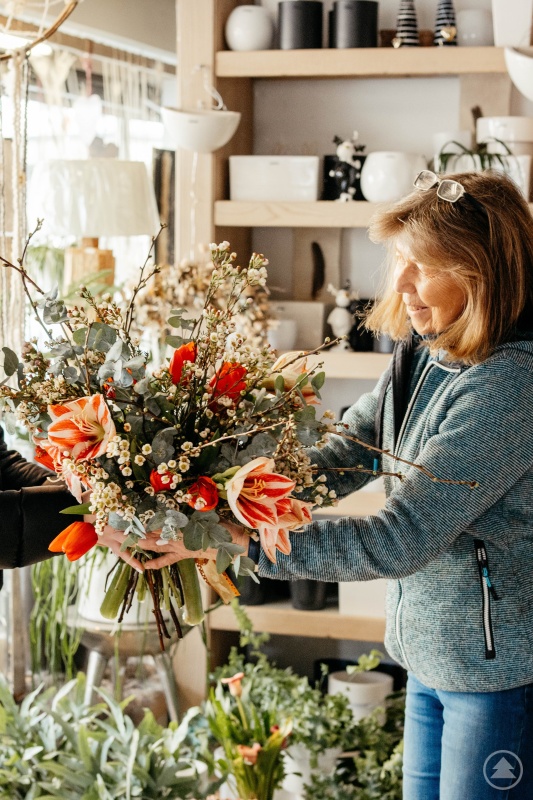 Foto: Inhaberin Theresia Schreiber vom Blumenhaus Schreiber überreicht der glücklichen Gewinnerin den farbenfrohen Blumenstrauß.