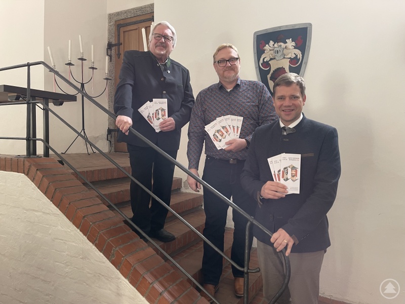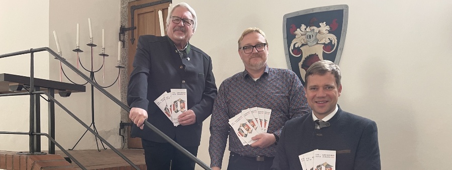 Trafen sich im Wappensaal des Straubinger Herzogschlosses: Erster Vorsitzender des Agnes-Bernauer-Festspielvereins Karl Weber (von links) und dessen Stellvertreter Florian Schmiegelt mit Bezirkstagspräsident Dr. Olaf Heinrich.