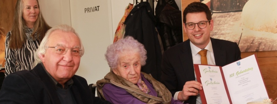 Nur wenige Menschen werden „dreistellig“. Franziska Sigl setzte mit der 101 am 16. Februar sogar noch einen weiteren Jubeltag drauf. Das feierte sie mit Familie, Frauenbund und VDK im Café der Marktbäckerei. Dazu gratulierten auch Bürgermeister Martin Pichler und Pfarrer Michael Bauer.