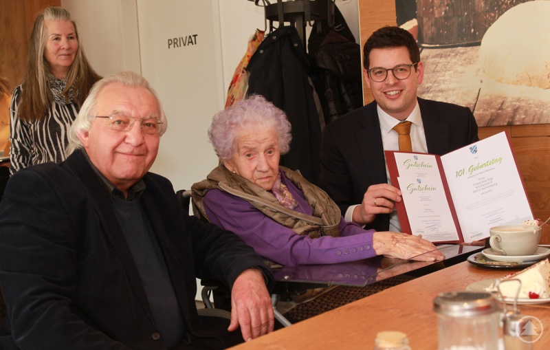 Nur wenige Menschen werden „dreistellig“. Franziska Sigl setzte mit der 101 am 16. Februar sogar noch einen weiteren Jubeltag drauf. Das feierte sie mit Familie, Frauenbund und VDK im Café der Marktbäckerei. Dazu gratulierten auch Bürgermeister Martin Pichler und Pfarrer Michael Bauer.
