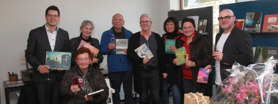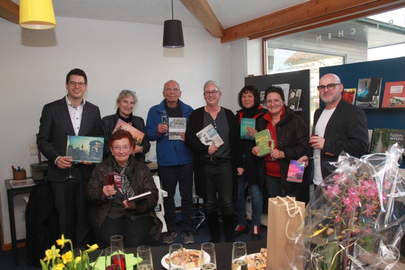 Bürgermeister Martin Pichler (stehend v.l.) gratulierte Hannelore Hopfer, Heinz Lang, Edith Döringer und Astrid Rodrigues mit Urkunde und Blumen zum neuen Standort eines reichhaltigen Verlagsprogramms in Schönberg. Veronika Egger und Josef Lang schlossen sich dem ebenso an wie Vermieterin Marianne Reith (sitzend).