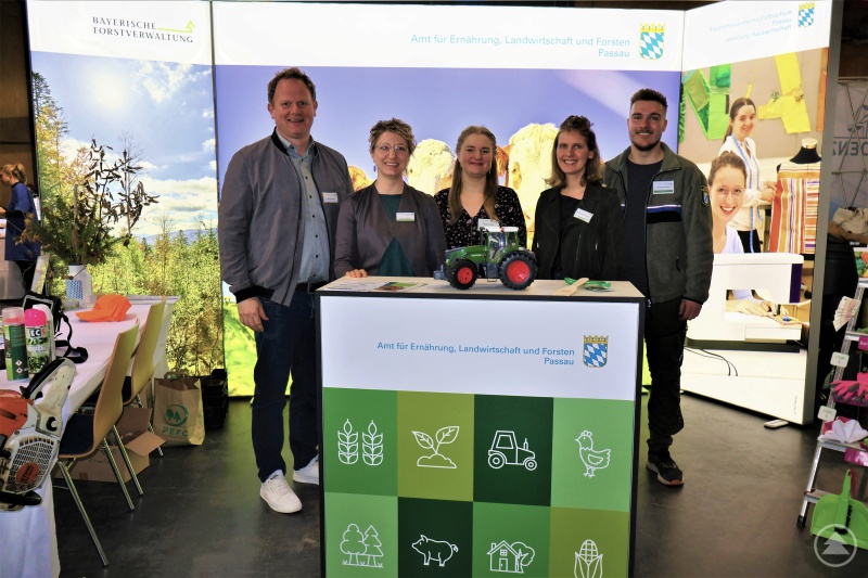 Martin Aumüller (Berufsschule Passau), Katrin Jodlbauer (AELF), Natalie Posch (KDBH), Katharina Kiermeier (AELF) und Johannes Drexler (AELF) am neuen Messestand des AELF Passau.
