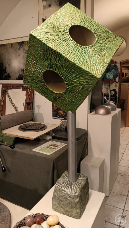 Im Vordergrund seines bescheidenen Ateliers steht die Bronze-Messing-Plastik "Apeiron". Das Kunstwerk bezieht sich auf die altgriechische Bedeutung der Unendlichkeit und Unbegrenztheit. Vielleicht ist genau deshalb ist der Korpus, der auf einem Bronze-Stamm majestätisch positioniert wurde, mit einem großen Loch auf jeder Würfeloberfläche versehen, das ins Innere führt und seine Begrenztheit aufhebt, gar löcherig werden lässt. In weiteren Werken bahnt sich die Natur ihren Weg durch eine andere Grenze: einen Zaun. Sie nimmt dort die Rolle des Akteurs ein und holt sich zurück, was einst ihr gehört hat. Vielschichtig sind die möglichen Interpretationen von den mehrzähligen Zyklen, die der Künstler im Laufe seines Lebens angelegt hat. Zyklen sind Serien, also die Variationen innerhalb eines Themas.