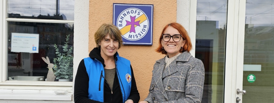 Angelika Leitl-Weber, Leiterin der Bahnhofsmission freut sich riesig über die überreichte Spende von Andrea Kleingütl vom Pfarrverband Fürstenstein.