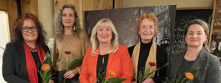 Freuen sich mit den Mitgliedern auf das Vereinsjahr 2024: wild&weiblich-Vorsitzende Roswitha Prasser (Mitte), die beiden stellvertretenden Vorsitzenden Manuela Binder (li.) und Maria Freund (re.) sowie die die Schriftführerin Cornelia Andrös (2.v.li.) und die Schatzmeisterin Bettina Steglich (2.v.re.).