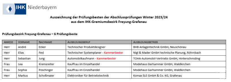 Knapp 1.600 Auszubildende aus dem gesamten IHK-Bezirk Niederbayern haben im vergangenen Winter ihre Abschlussprüfungen abgelegt. Mit der Bestnote „sehr gut“ abzuschließen, ist dabei alles andere als einfach. Nur neun Prozent der Absolventen erreichten die Durchschnittsnote 1. Sechs Auszubildende aus dem Landkreis Freyung-Grafenau haben dies aber geschafft.