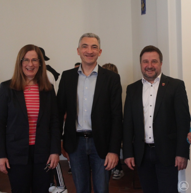 Einrichtungsleiterin Michaela Meindl begrüßte Landrat Dr. Ronny Raith und Bürgermeister Karl-Heinz Eppinger beim Tag der offenen Türe im Caritas BBZ in Zwiesel.