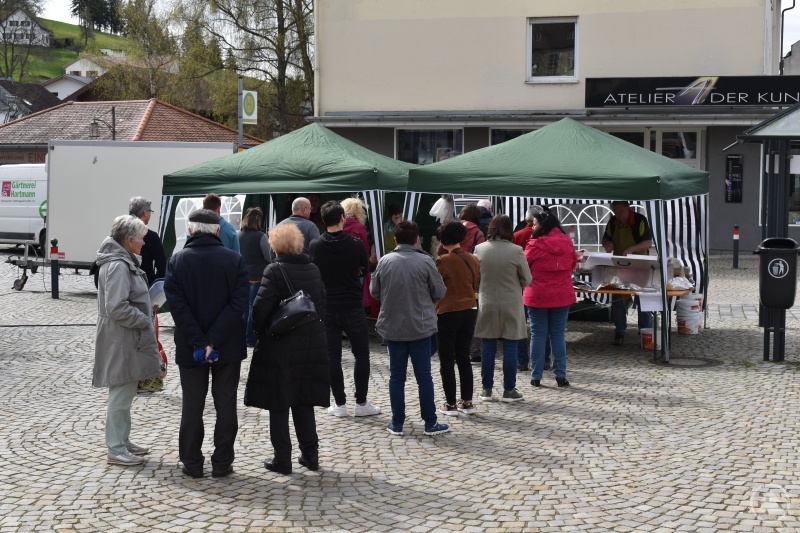 Fünf Mitglieder sorgten hier für das leibliche Wohl der zahlreichen Vorbesteller und Vorbestellerinnen. Wer einen Blick auf die Warteschlange wagt, kann es sich denken: Geduld war auch beim Fischverkauf am Karfreitag eine Tugend. Dennoch war die Stimmung unter den Wartenden durchwegs gut. Ob das an der Vorfreude auf die fischigen Genüsse lag? Das ist nicht unwahrscheinlich. Sicher lässt sich jedenfalls sagen:
