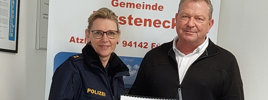 Erfreut zeigte sich Bürgermeister Alexander Pieringer über die Sicherheitslage in der Gemeinde Fürsteneck beim Sicherheitsgespräch mit der Freyunger Polizeichefin PORin Ingrid Grötzinger. Bei ohnehin niedrigem Niveau ist die Anzahl der Delikte in Fürsteneck im letzten Jahr noch weiter zurückgegangen. Mit 9 Fällen hatte Fürsteneck nicht nur die niedrigste Zahl an Straftaten insgesamt aufzuweisen, sondern auch die niedrigste Häufigkeitszahl, d. h. die wenigsten Delikte im Verhältnis zur Anzahl der Gemeindebewohner. Es waren nur wenige Delikte im öffentlichen Raum und keine Rauschgiftdelikte zu verzeichnen. Bemerkenswert war der schadensträchtige Einbruch in der Gaststätte Schrottenbaummühle. Erfreulich war zwar der Rückgang der Verkehrsunfälle von 26 auf 22. Dabei wurden jedoch 5 Personen zum Teil schwer verletzt. Ein Unfall wurde von einem betrunkenen Fahrer verursacht. An einigen neuralgischen Stellen ist eine Geschwindigkeitsmessung technisch nur eingeschränkt möglich. Daher werden von der Polizei in Zusammenarbeit mit der Gemeinde weitere Möglichkeiten zur Steigerung der Verkehrssicherheit geprüft. Zudem wird die Polizei in der naturnahen Ilztal-Gemeinde Fürsteneck ein besonderes Augenmerk auf den Umweltschutz richten.