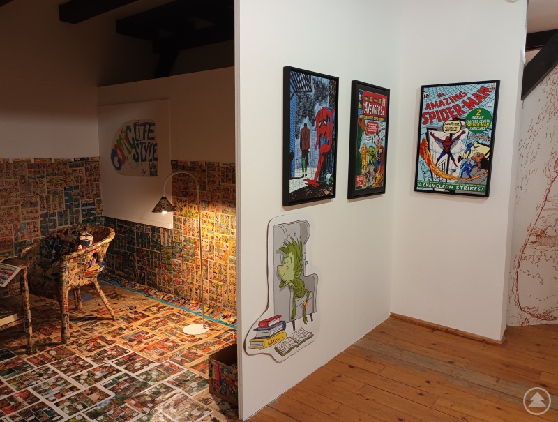 Generell wurden in die Sonderausstellung für die ganze Familie viele Mitmachstationen integriert. Sie luden kleine und große Museumsgäste zum Miträtseln und Raten ein. Durfte es im Anschluss ans Tüfteln dann eine kleine Verschnaufpause sein, ging es in die gemütliche Lounge. Auch sie war thematisch ganz im Zeichen von Comics & Co. gehalten.
