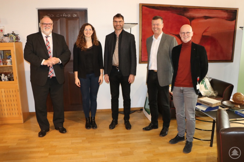 Oberbürgermeister Jürgen Dupper (von links) lud Theresa Mocker (Abteilungsleiterin des Wasserwirtschaftsamtes für den Bereich der Stadt Passau), den zukünftigen Behördenleiter des staatlichen Wasserwirtschaftsamtes Deggendorf, Siegfried Ratzinger, den aktuellen Behördenleiter, Michael Kühberger und Wolfgang Seiderer (Baureferent der Stadt Passau) zu einem Besuch in sein Amtszimmer ein.