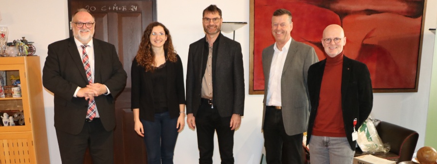 Oberbürgermeister Jürgen Dupper (von links) lud Theresa Mocker (Abteilungsleiterin  des Wasserwirtschaftsamtes für den Bereich der Stadt Passau), den zukünftigen  Behördenleiter des staatlichen Wasserwirtschaftsamtes Deggendorf, Siegfried  Ratzinger, den aktuellen Behördenleiter, Michael Kühberger und Wolfgang Seiderer  (Baureferent der Stadt Passau) zu einem Besuch in sein Amtszimmer ein.